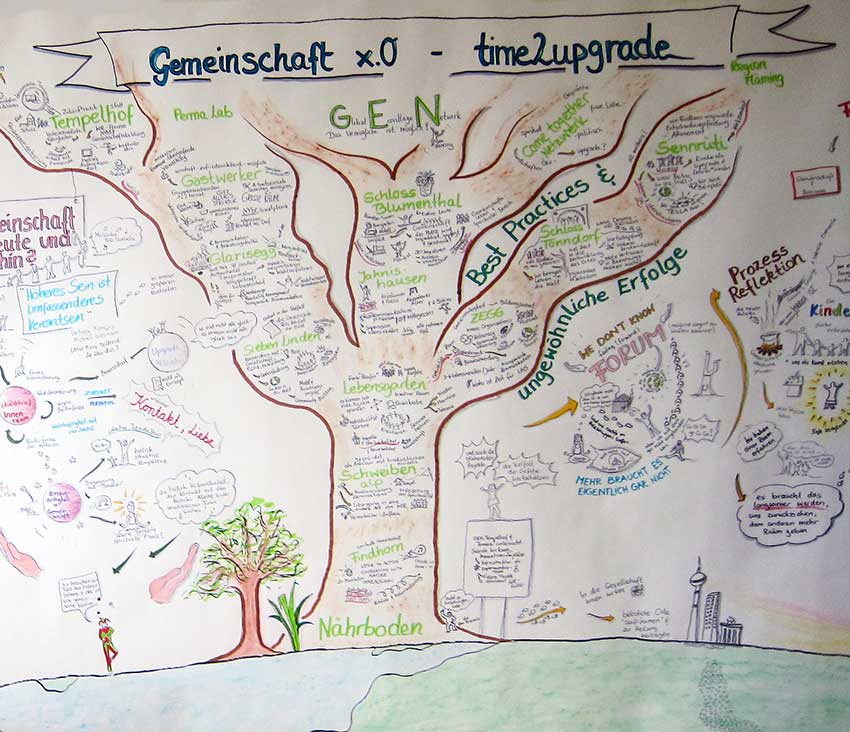 Darstellung der Entwicklung der Gemeinschaftsbewegung als Baum, graphic recording von Katrin Finken. Foto: Stella Veciana.